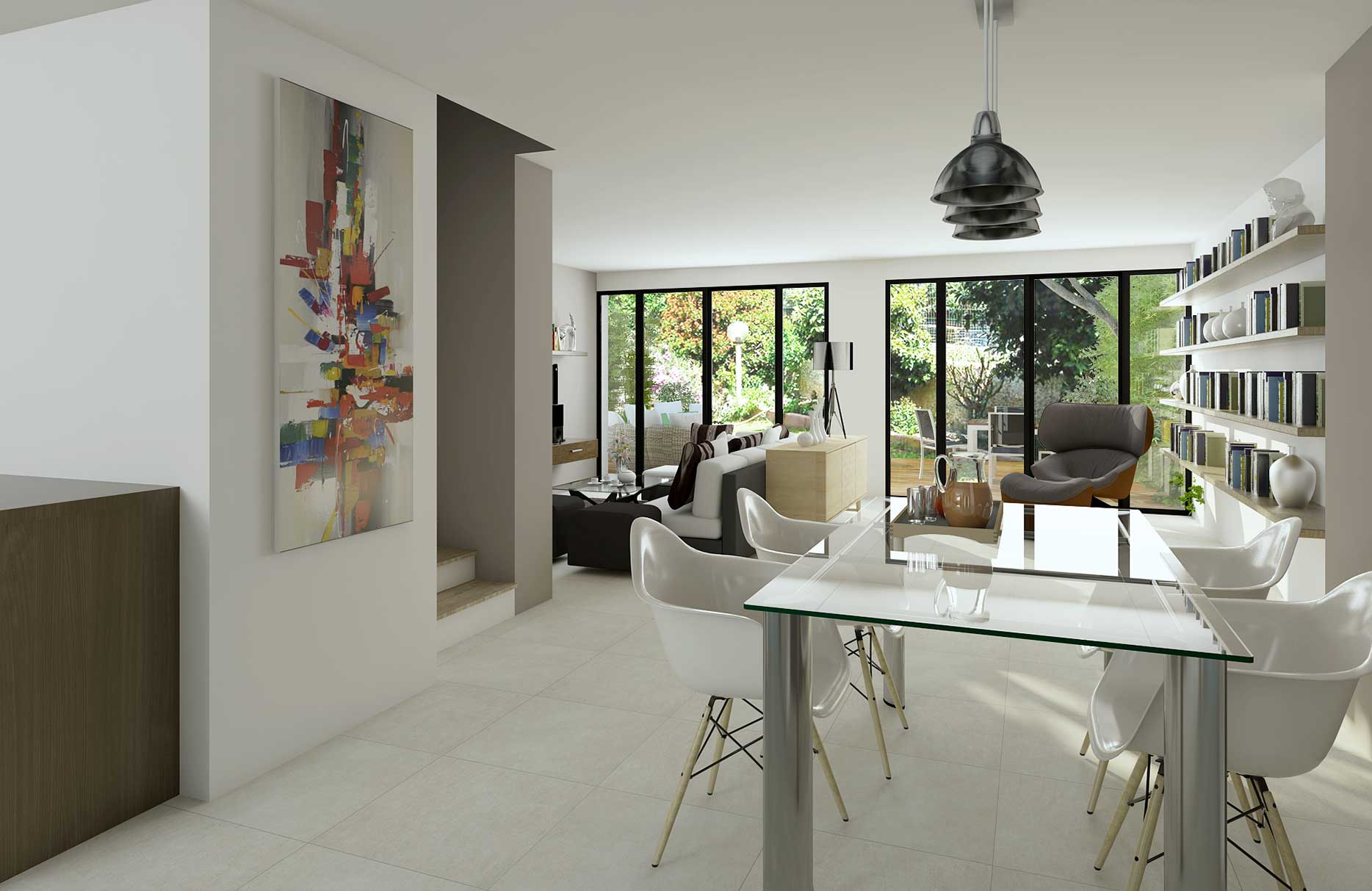 Elles disposent, au rez-de-chaussée, de grands espaces de vie fonctionnels et lumineux (cuisine ouverte), conçus pour partager de multiples moments de vie familiale.