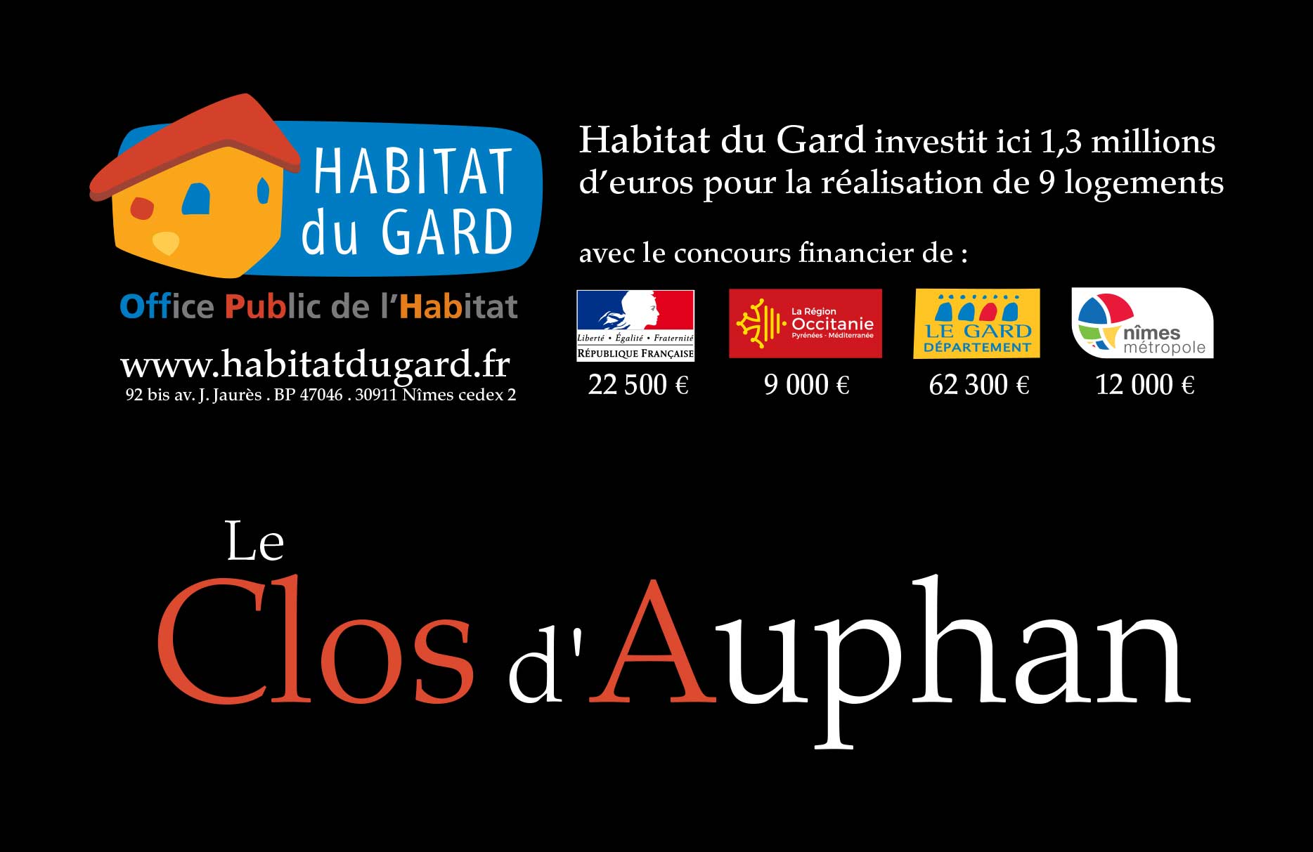 Elle représente un un investissement de 1,3 millions d'euros pour Habitat du Gard avec le concours financier de l'État à concurrence de 22 500 euros, de la Région Occitanie à concurrence de 9 000 euros, du Département du Gard à concurrence de 62 300 euros et de Nîmes Métropole à concurrence de 12 000 euros.
