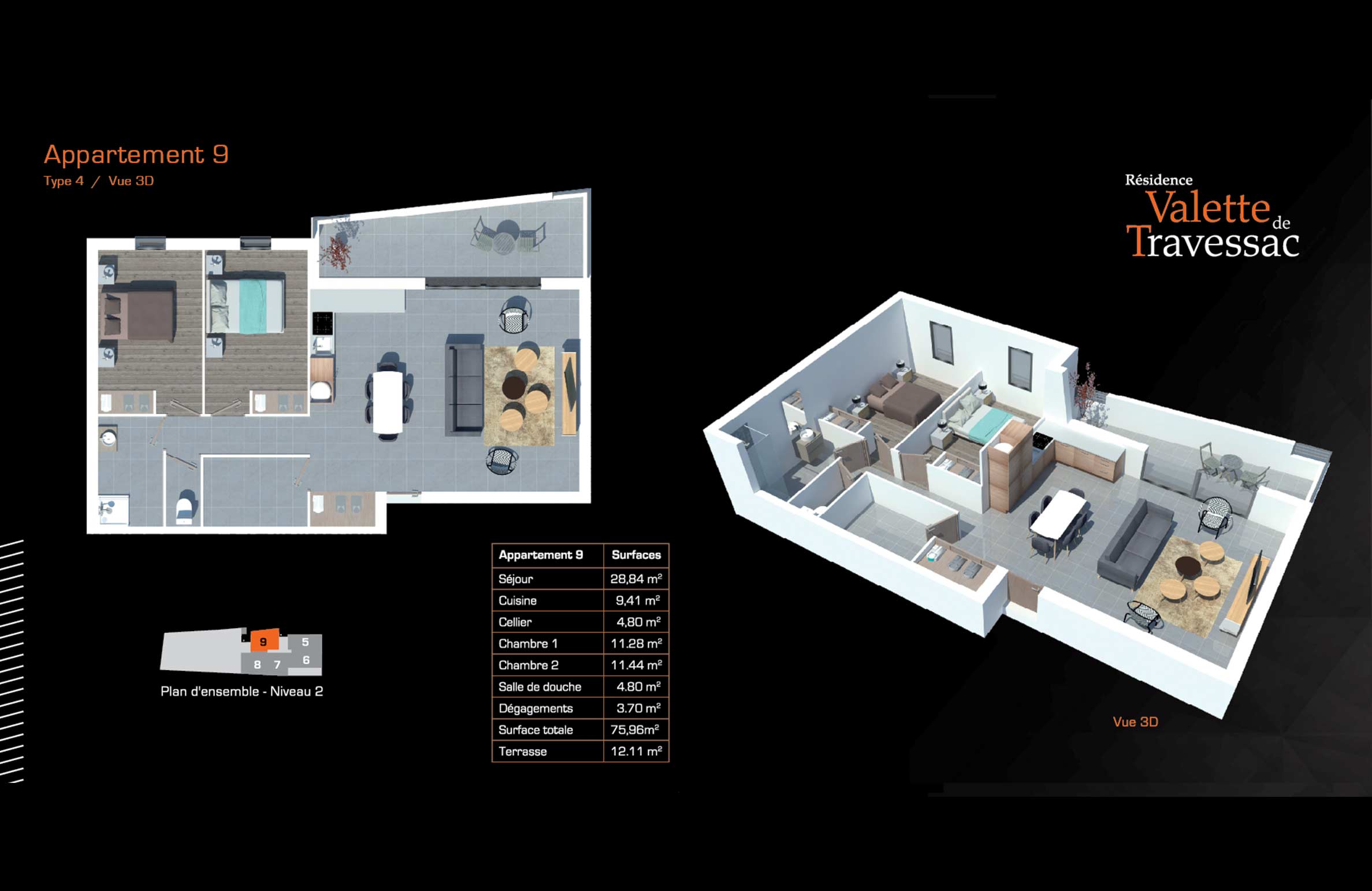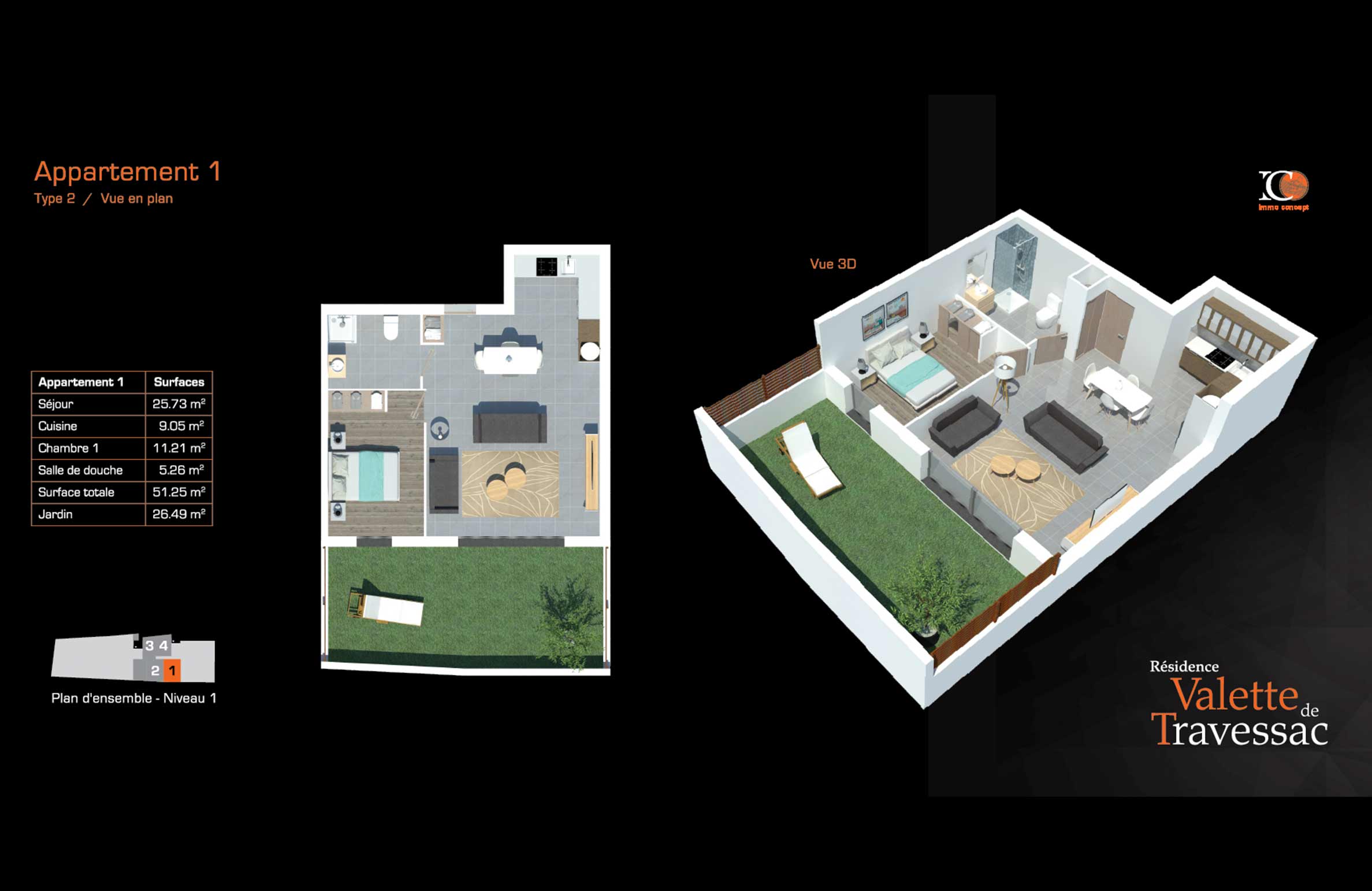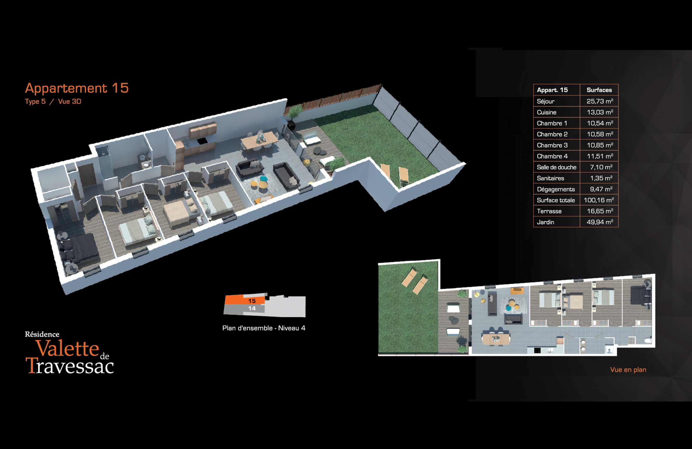 Du T2 au T5. Les appartements de Valette de Travessac offrent un vaste espace de vie fonctionnel.