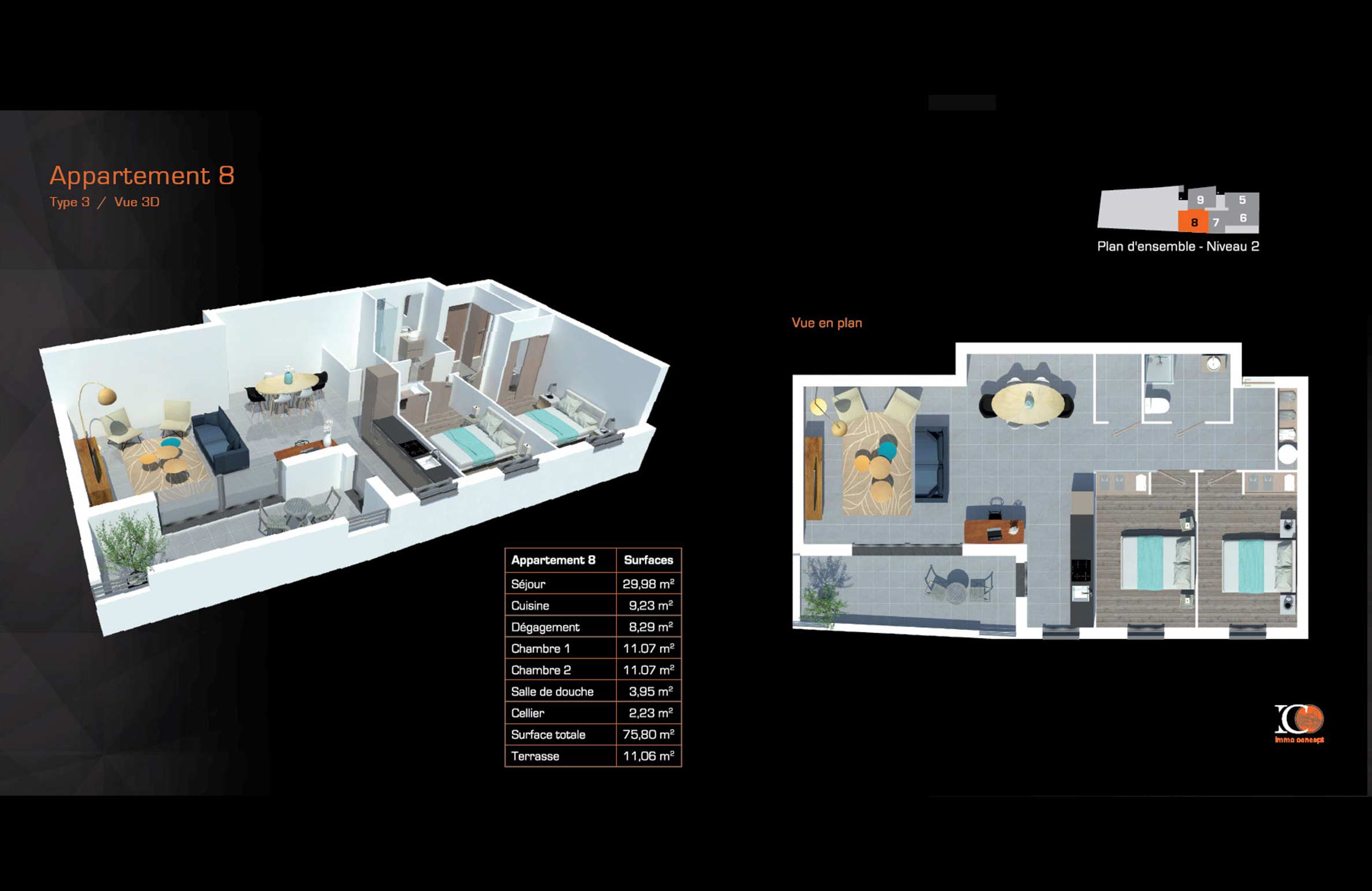 Dans le même esprit de convivialité alliée aux qualités fonctionnelles, ces appartements sont conçus en accord avec un mode de vie actuel : espace de vie lumineux, espace cuisine ouvert pour des moments familiaux partagés, salle de douche aménagée, volets roulants motorisés.